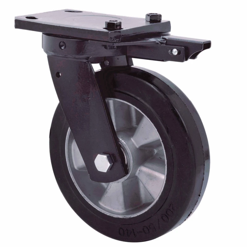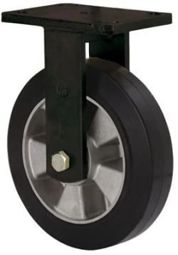 Rollen mit Aluminiumkern und Reifen aus elastischem schwarzen Gummi mit einer Härte von 70º shore A. Sie sind besonders für schwere Ladungen bis zu 500 kg geeignet.
