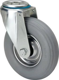 Undurchstechbare graue Rollen mit Metallfelge und elastischem Laufbelag, besonders geeignet für Ladungen bis zu 75 kg.