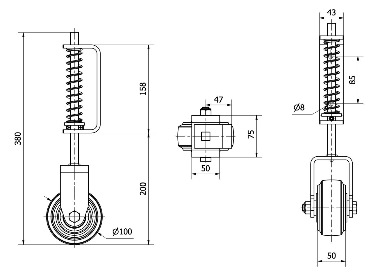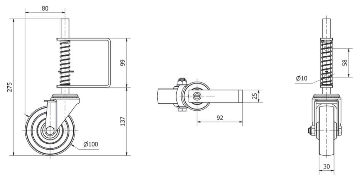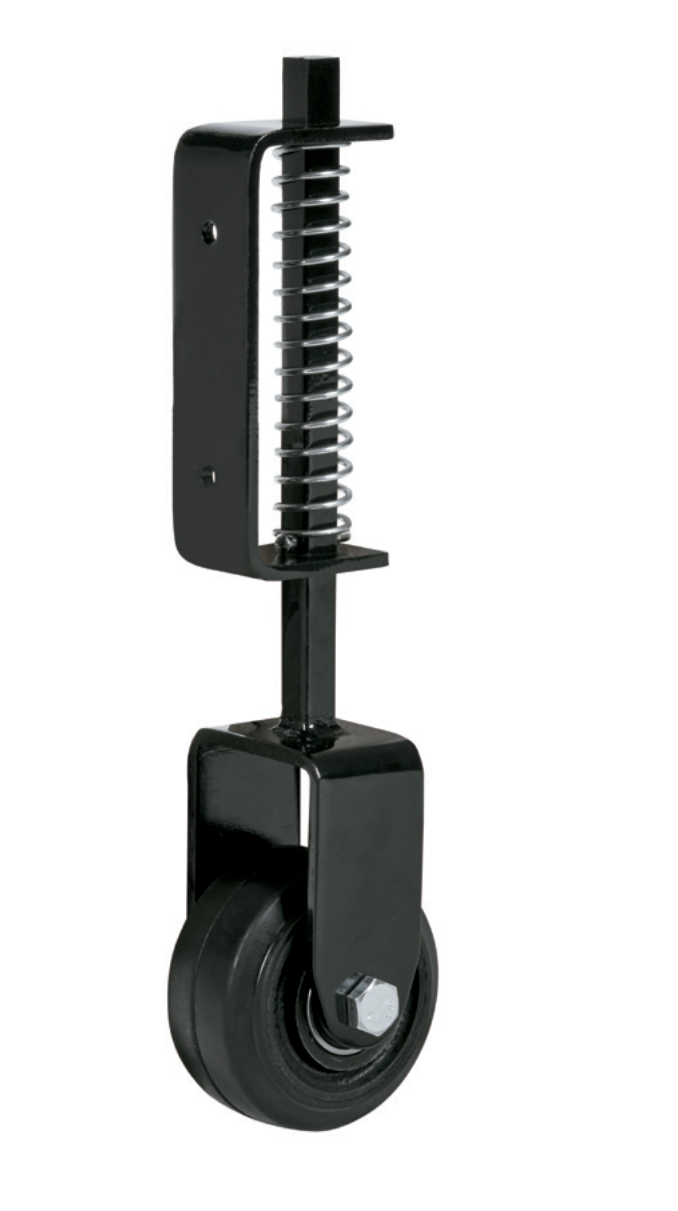 Acabado soporte: pintado negro. Rueda de goma elástica y núcleo de acero. Dureza 85º shore A. Especial para puertas de exterior.